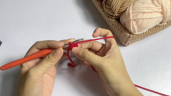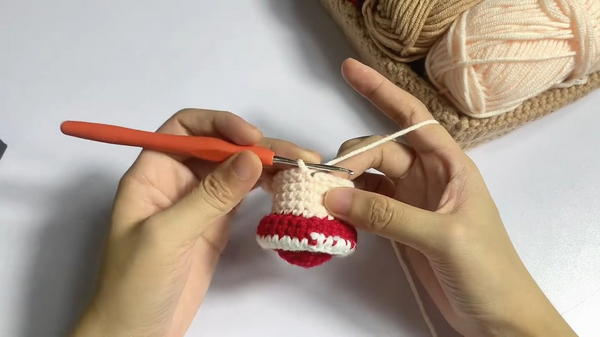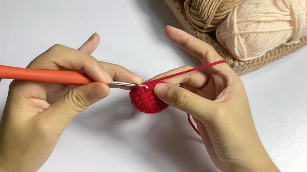 - Round 1: Using red yarn, create a magic ring and work 6 single crochet (sc) inside it. Pull tight to close the circle.
