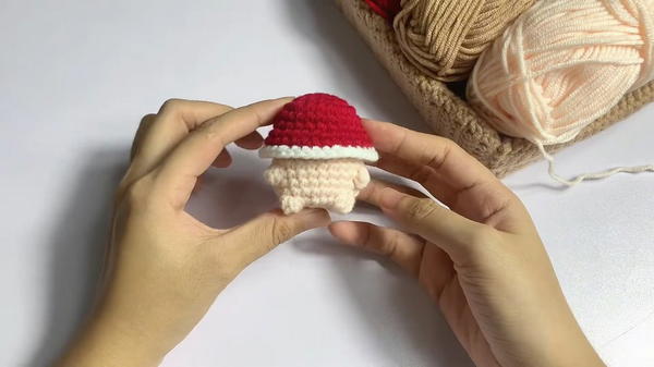 - Use yarn or safety eyes and a small blush detail for facial features approximately on round 13 of the cap.