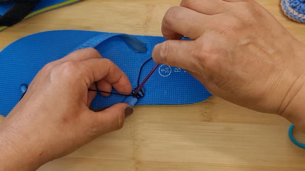 - Start by securing yarn at the base of the flip-flop strap using a double knot. Leave a short tail to weave in later.