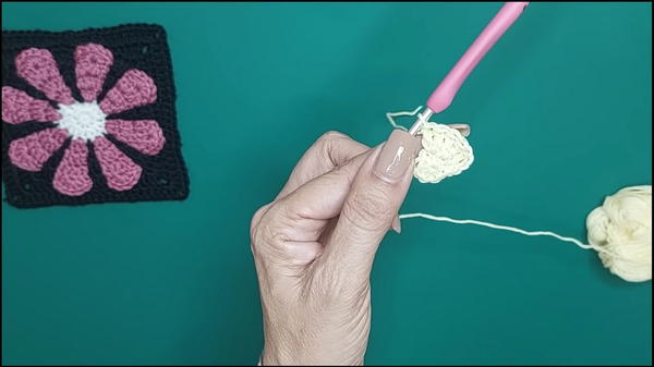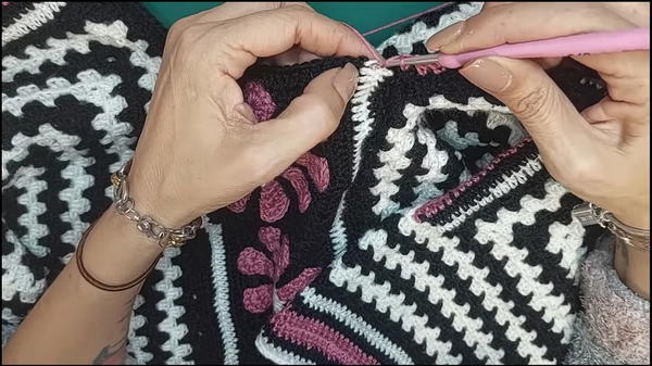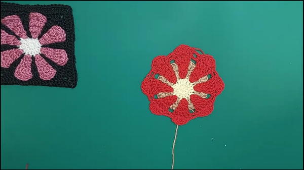The sweater’s construction begins with crocheting individual elements, such as vibrant flowers crocheted from a magic ring.