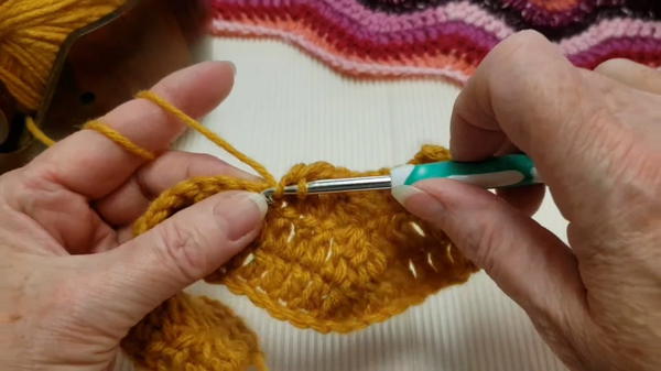 - Alternate valleys and peaks throughout the row, with five double crochets between each feature.