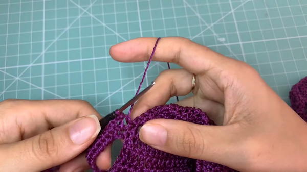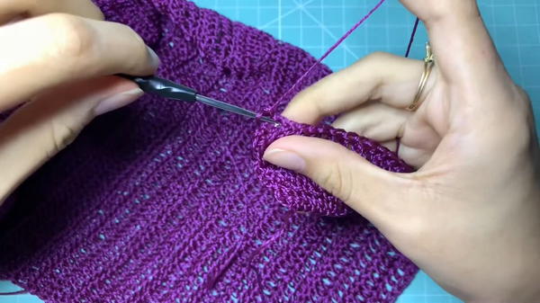 - At the beginning and second-to-last stitch of each row, work increases by making 2 dc in the same stitch. This forms the diagonal growth to shape the top.