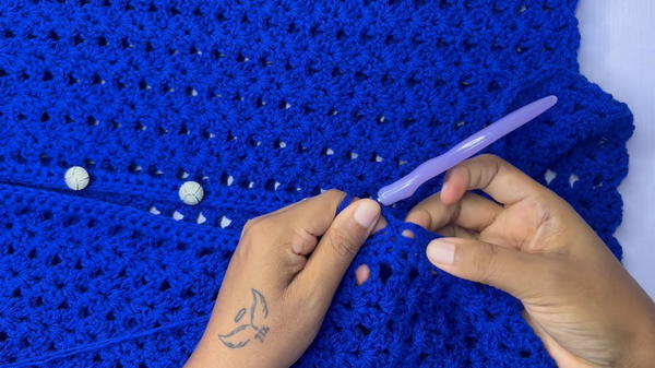 - Check buttonhole size with buttons before completing single crochet rows to ensure proper fit.