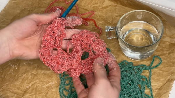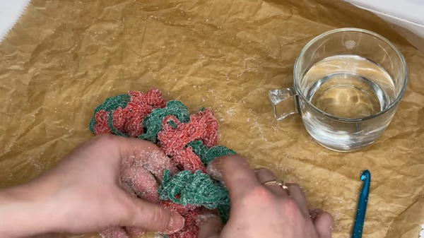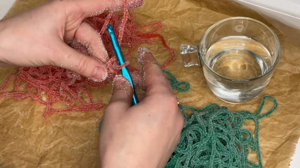 If the candy softens and becomes hard to crochet, refrigerate it briefly to firm up the strands. This will make it easier to manage while working on your project.