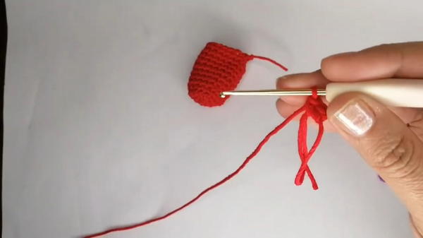 Start with a Magic Ring: Use red yarn to form a magic ring and secure it with a chain. Crochet 6 single crochets into the ring.