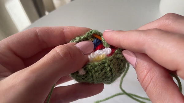 - Pull the yarn to scrunch the top closed, then sew a couple of extra loops to secure it.