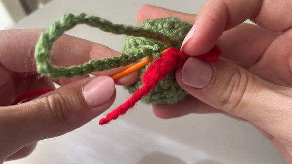 - Use a piece of red yarn to create a slip knot and chain to the desired length for a bow.
