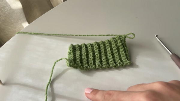 - Continue chaining 1, turning the work, and doing 10 single crochets in the back loops only for each row.
