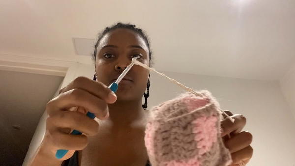 - After completing 5 double stitches with the first color, stop when you have two loops on the hook.