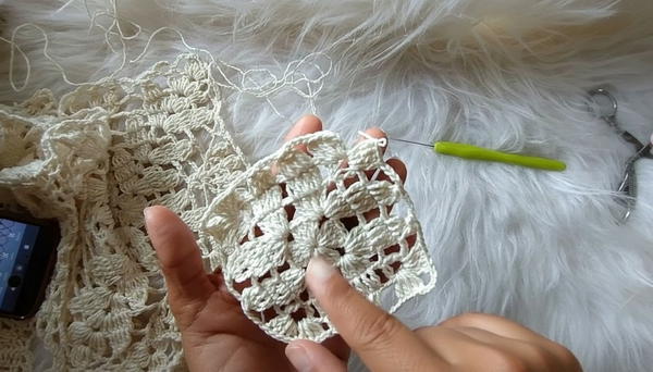 This square motif crochet blouse showcases beautiful fan stitches and open mesh construction, transforming simple crochet into a sophisticated garment. With customizable sizing, elegant design, and practical finishing, it is an excellent intermediate project promising wearable artistry.
