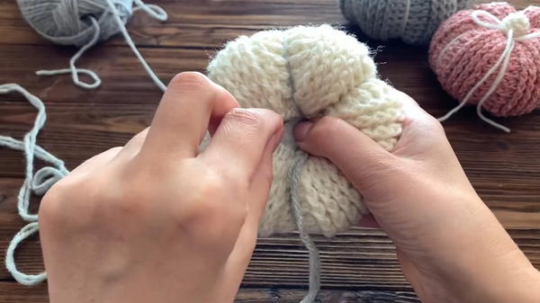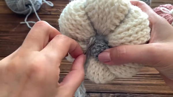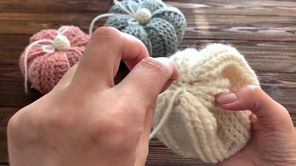 After cinching the top and bottom, the pumpkin is stuffed to achieve a plump, rounded shape. To enhance its visual appeal, sculpting stitches are added, creating natural-looking ridges. The final touch a handmade stem can be made from yarn or a natural twig, adding authenticity and charm.