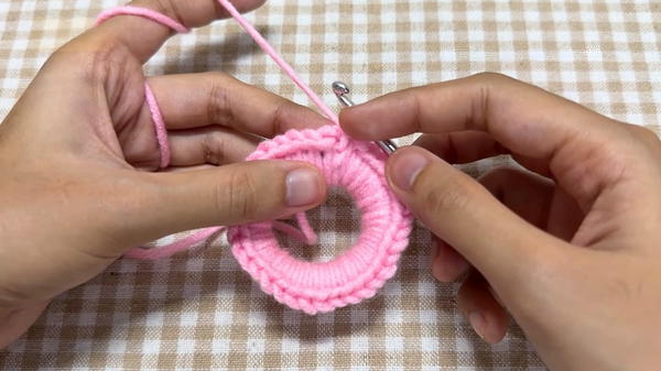 - Repeat this around the scrunchie while carrying the tail yarn to avoid excess weaving in later.