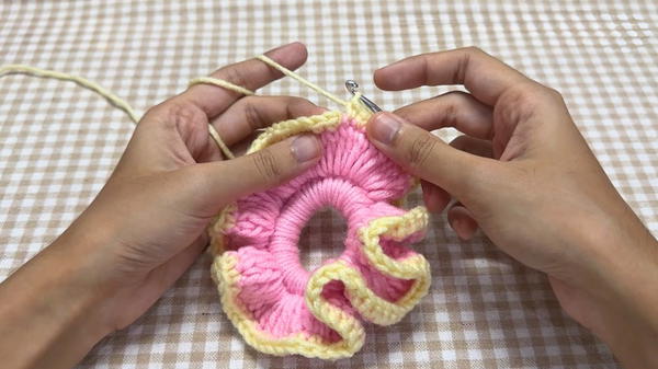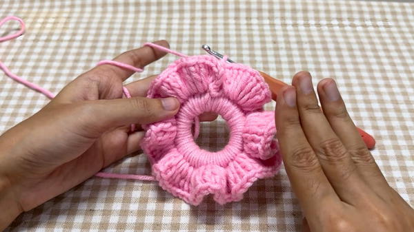 When adding the ruffles, ensure that your three double crochets are evenly spaced to create consistent, full ruffles. This enhances the scrunchie’s visual appeal and texture.