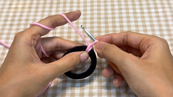 - Insert your hook into the center of the hair tie, yarn over, and pull up a loop.