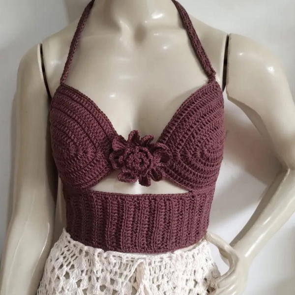 This is a detailed pattern based on a crochet tutorial for a trendy floral crop top that is all the rage right now. The top features a simple foundation of double crochet stitches with charming floral appliqués, finished with delicate straps that cross in the back. Suitable for intermediate crocheters who are comfortable with basic stitches and assembling pieces, this project yields a stylish, wearable piece perfect for summer and festive occasions.