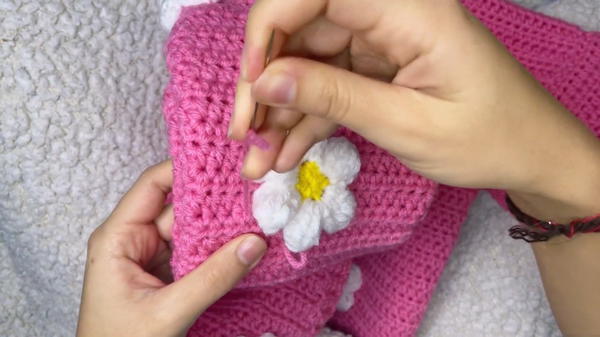- Secure the flowers by stitching each petal with pink yarn, tying a knot at the back for stability.