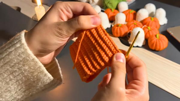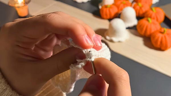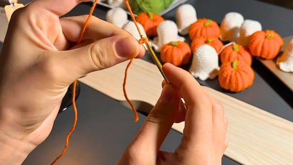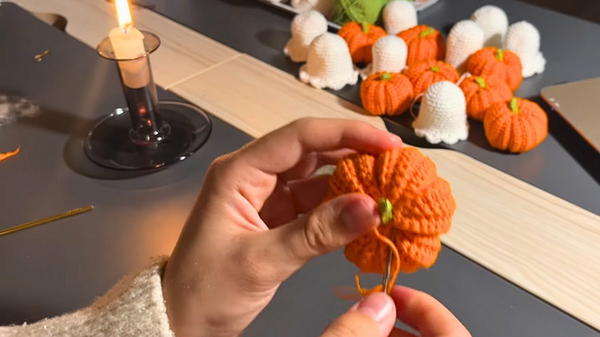 With the leftover yarn tail, wrap around the pumpkin’s sides multiple times, pulling through the top and bottom to form the pumpkin's classic ridges. Secure with a knot and weave in the ends.