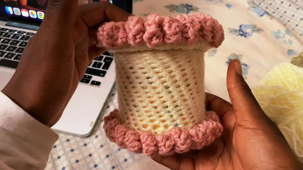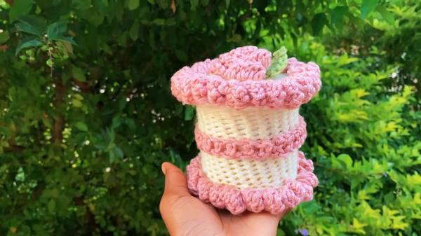 The crocheted cake features a firm container base, giving it structure and stability. Beginning with a magic circle and working single crochets, the base is gradually built through rounds of increases.