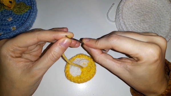- Place the completed yolk on the white base basket tray and sew it in place.