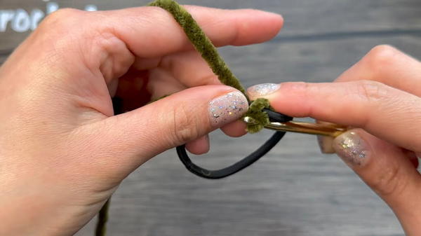 Since the key to this scrunchie is volume, pay close attention to your stitch count in the first round. If you feel your 50 SCs are still leaving gaps where the elastic shows when stretched, continue adding more SC stitches until the elastic is completely concealed. A dense base guarantees a full, non-slip scrunchie! [03:50]