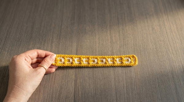- At the end of the row, cut the yarn, tie off with a chain 1, and secure.