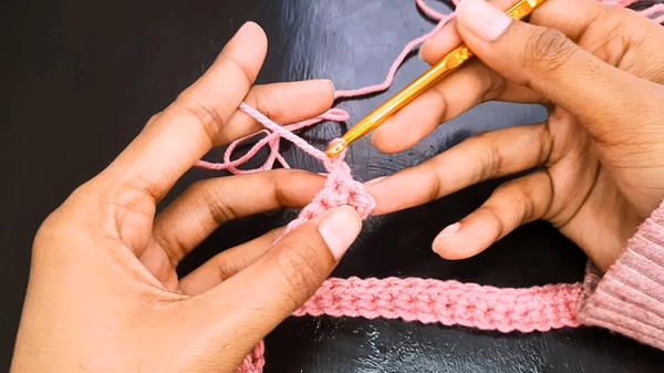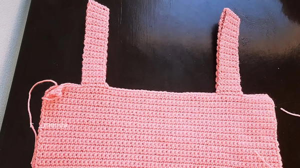 - Crochet seven single stitches wide straps, ensuring they match your desired length (Marida crocheted 52 rows).