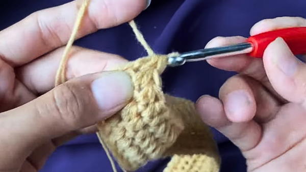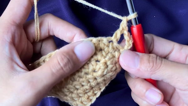 - Add two more HDC stitches in the middle part to extend the base and then crochet along the opposite side using HDC until the last stitch.
