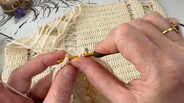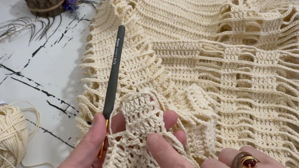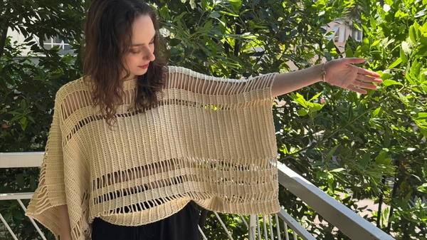 The process of crocheting this oversized blouse is as enjoyable as the final product. Starting at one sleeve, the project advances toward the body, alternating simple and foundational stitches, like chains and double crochets.