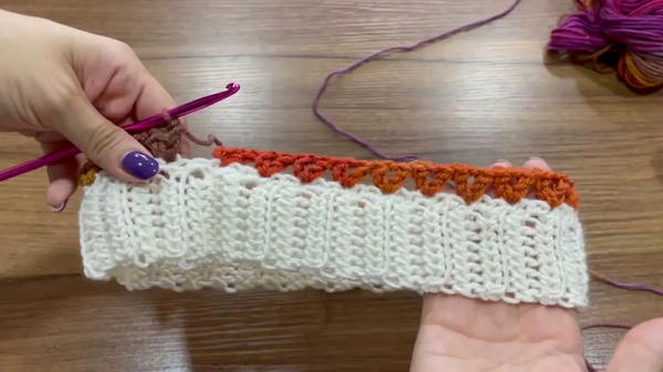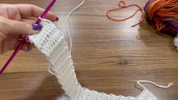 The early rounds establish a solid circular base, the mid-section develops the signature V-stitch for an open, textured effect, and the final rows taper slightly for a snug, finished fit.