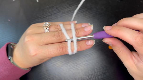 - Wrap the yarn around three fingers, crossing at the back, and hold the tail with your thumb.
