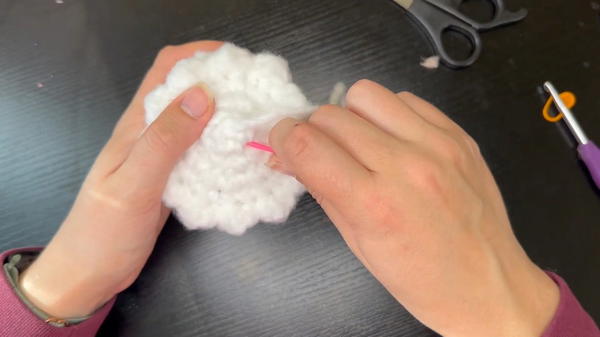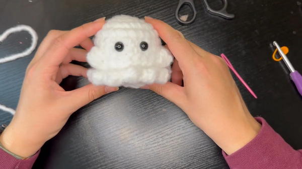 - Weave the tail through the last few stitches. Pull tightly to close the hole entirely, knot the yarn, and weave the tail into the ghost for a clean finish.