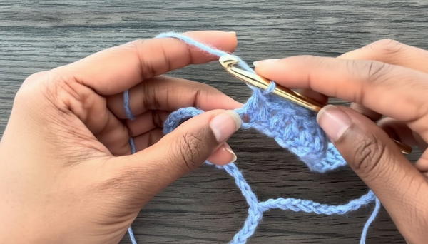 - Double crochet (dc) into the next chain and continue dc in the next 7 chains (9 stitches total including no turning chain).