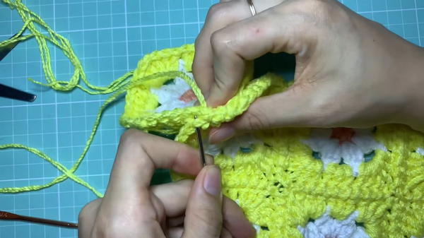 - Use the tapestry needle and yarn to sew the granny squares together by catching the outer loops only from each side. This creates a neat seam.