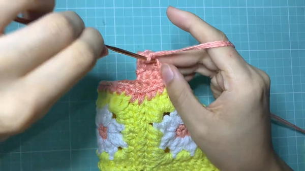 - Using the pink yarn triple strand, insert your needle in the edges of the top to work the border.