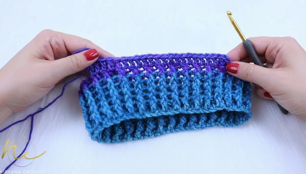 - Switch to a pattern alternating rounds of dc stitches and crossed double crochets (for visual interest).