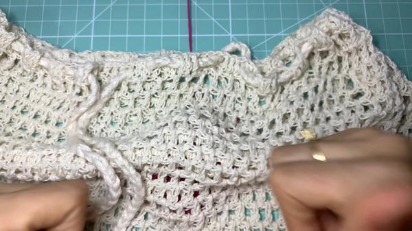 - Thread the cord through the double crochet spaces around the waist.