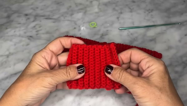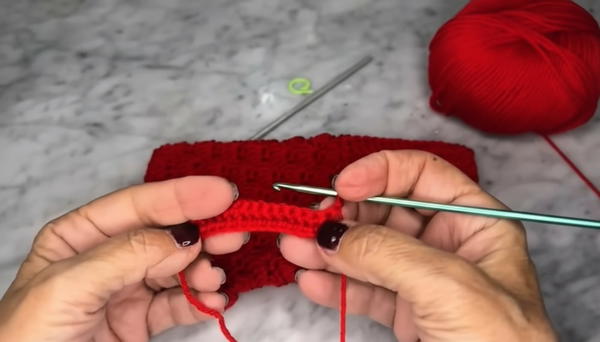 - Work 15 sc in back loops only along the row (this creates an elastic band).
