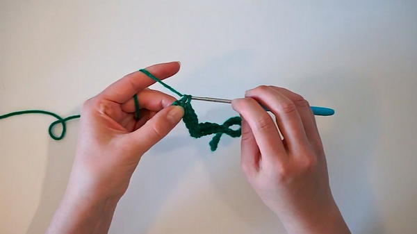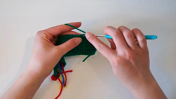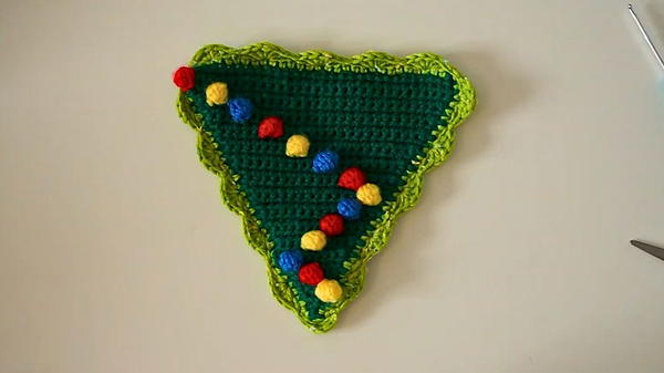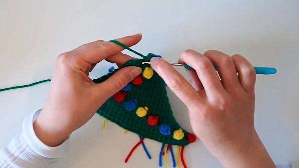 - Fine weight yarn: Green (base), red, yellow, and blue (Christmas lights), and another color (scalloped edge).