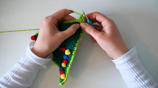 The process begins with crafting the triangular base in a green tone, skillfully shaped row by row using decreases for crisp edges.