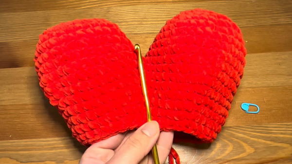 - Close any gaps between the two heart humps at the top by stitching them together with red yarn.