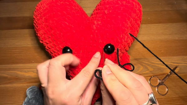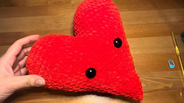 - Insert the 20 mm safety eyes in the desired position. These should be placed symmetrically on the heart body.