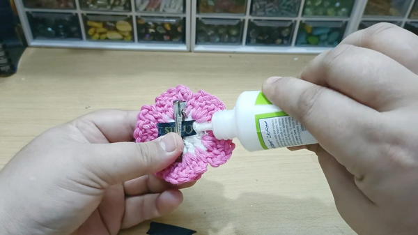 - Align the crochet flower and press it gently onto the glue-covered base.