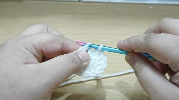 - Once the knot is secure, cut the initial yarn color and continue working with the new color.