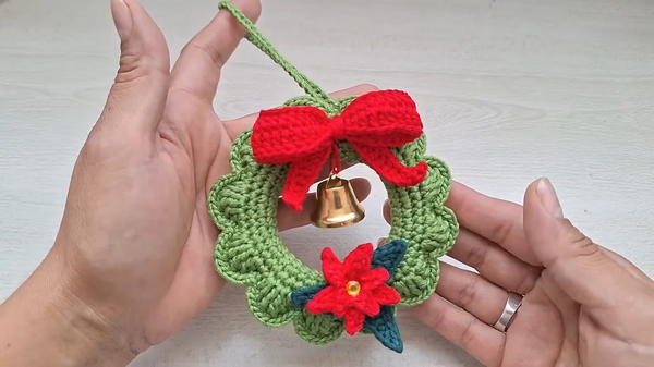 A mini crochet Christmas wreath is a perfect handmade festive decoration that symbolizes prosperity and health. It can be hung on a Christmas tree, used as a home decoration, or given as a thoughtful handmade gift. This project results in an 11 cm tall mini-wreath and features intricate details such as a ruffled texture, a bow, leaves, a flower, and the option of adding a bell.