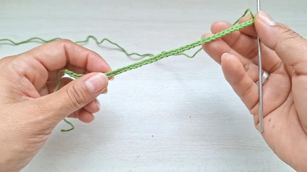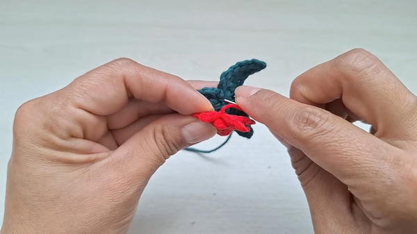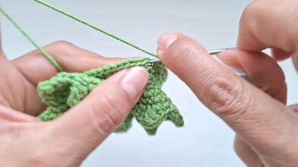 A simple magic ring technique is used to form the red flower, which is then paired with delicate green leaves to accentuate the overall design.