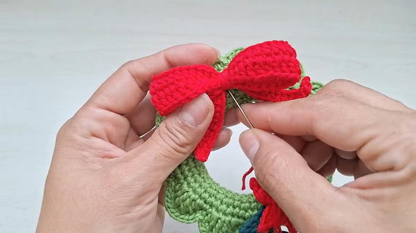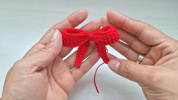 The bow, made from red yarn and shaped with precision, is tied with a neat center to create an elegant focal point.