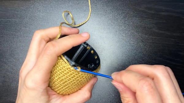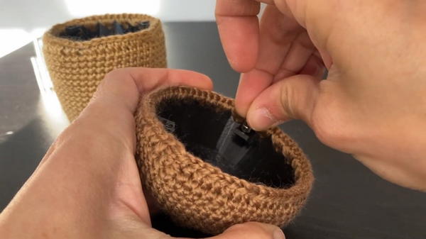 - Cut the yarn, secure the tail, and hide it neatly between your crochet and the container.