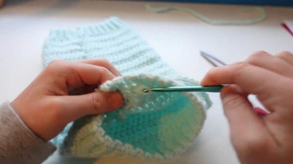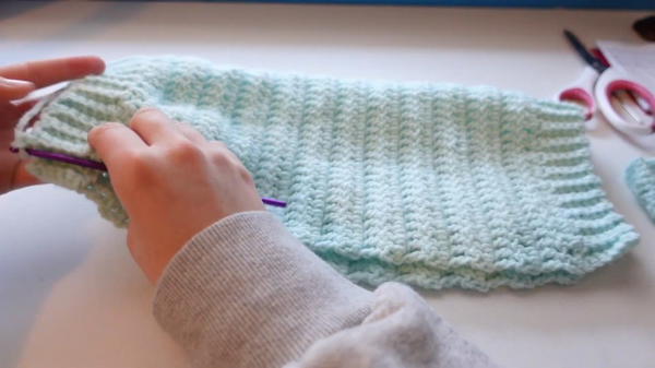 The process begins with a snug ribbed section, worked with single crochets, followed by rows of double crochets to create the middle body.