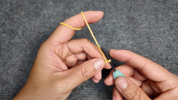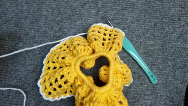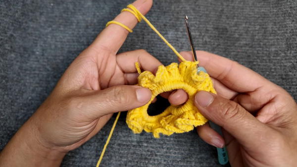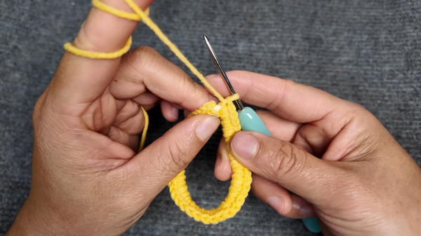 The process begins by securely covering the hair tie with tight single stitches, providing a durable foundation for the design ahead.