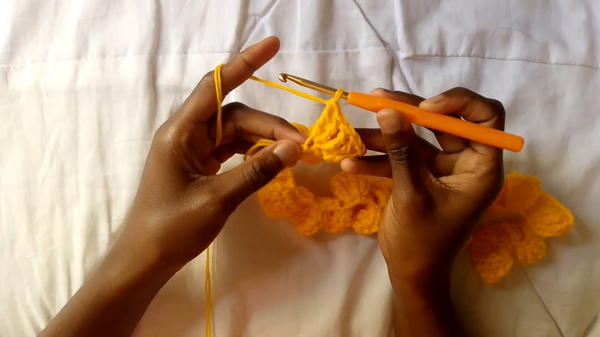 - Thread the string through the bottom spaces of the first row (where the treble crochets created ruffles). Juliet places the string randomly in the spaces along the ruffles.